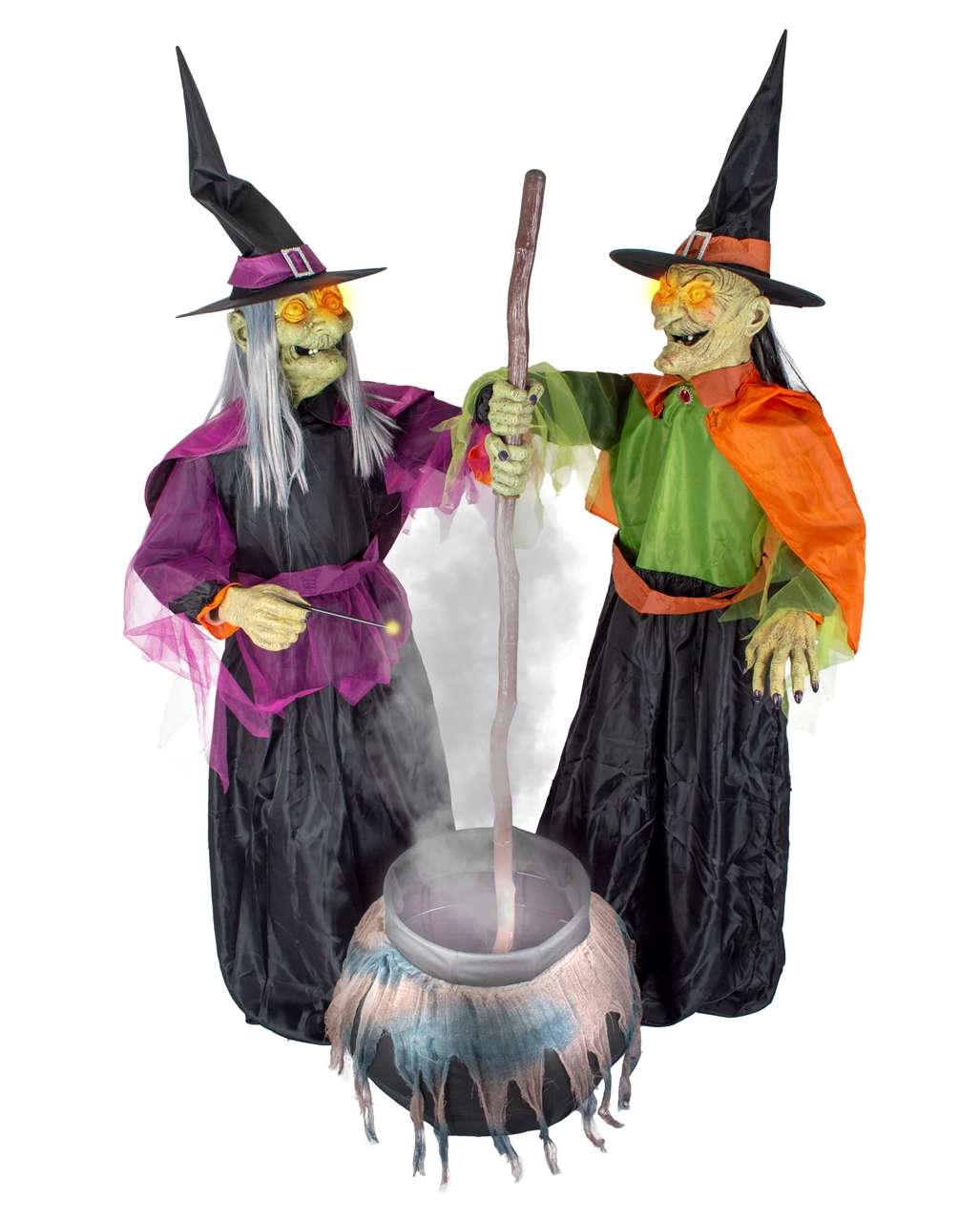 So bezaubernd und doch so gruselig: die 2 Kochende Hexenschwestern sind das Highlight deiner Geisterbahn Deko. Die schaurigen Hexen freuen sich jetzt schon auf die Halloween Nacht. Mit ihren unheimlichen Geräuschen und den leuchtenden Augen werden sie deinen Gästen ordentlich einheizen. Mal sehen, wer sich tapfer an der gruseligen Deko vorbei wagt, ohne sich vor Angst in die Hosen zu machen. wer weiß schon, wen die Schwestern in ihrem Kessel wirklich kochen wollen.