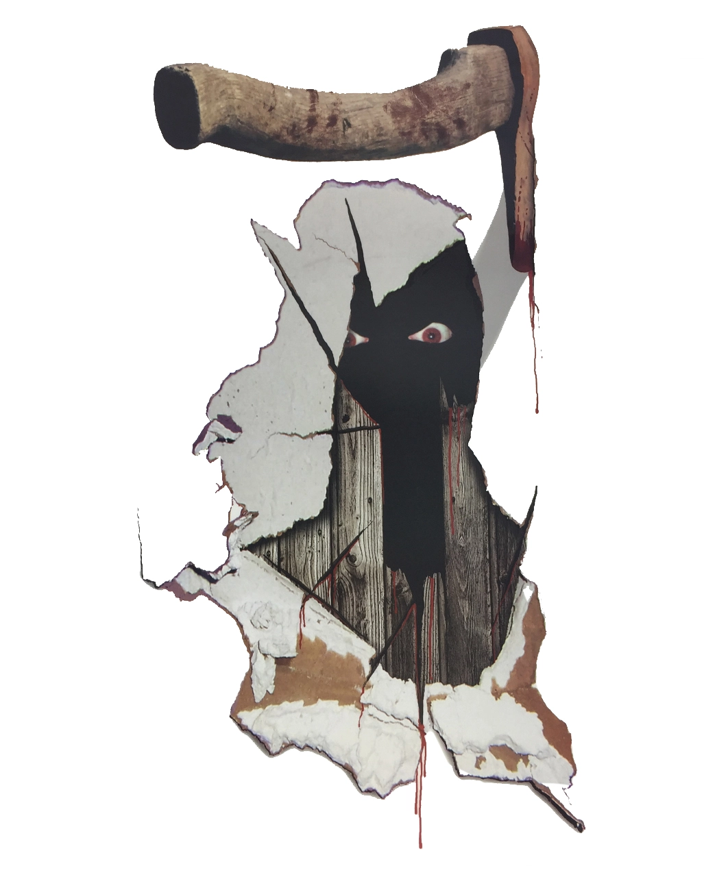 Shinning Feeling Pur! Halloween Dekofolie mit der Abbildung einer offensichtlich eingeschlagenen Tür oder Mauer, durch die bedrohliche Augen starren. Die dazu verwendete mörderische Axt steckt noch daneben und frisches Blut tropft herunter.