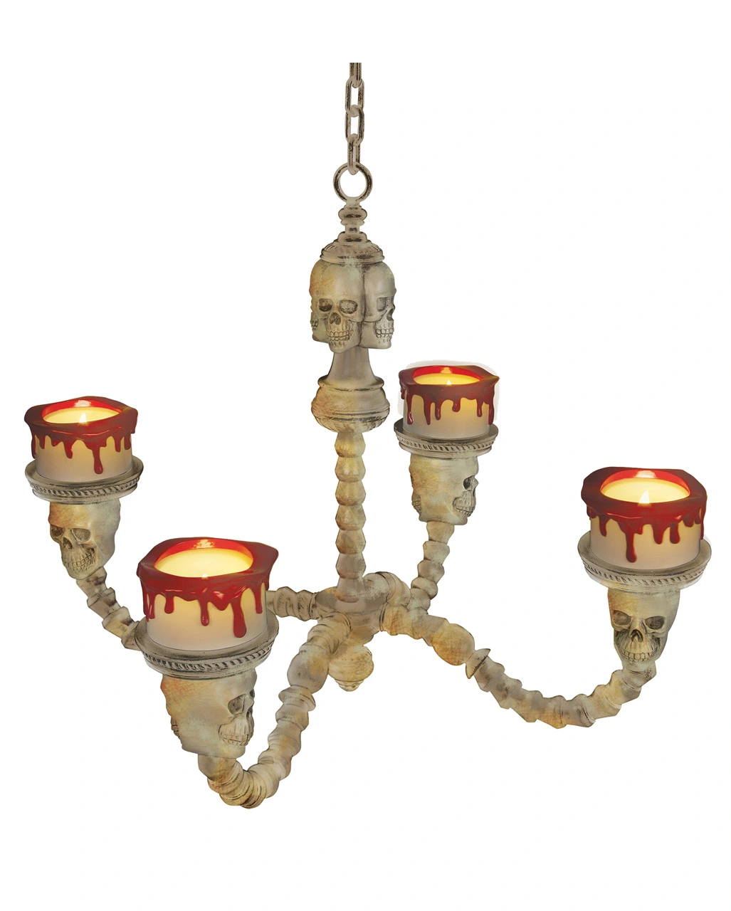 Der Kronleuchter Totenschädel in Knochenfarben mit flackerndem LED Licht hat die Form eines klassischen Kronleuchters mit antiken Details & Totenköpfen. An jedem der 4 Arme der Grusel Dekoration ist ein beiger, blutiger Kerzenhalter in den genau ein LED-Teelicht passt. Aufgehängt wird der Dekorations-Kronleuchter an einer Kunststoffkette mit großem Ring. Den 4-armigen Kerzenleuchter kannst du auch super als Adventskranz benutzen. Passend dazu der Kerzenständer mit LED Kerzen & Kerzenleuchter mit Totenköpfen & LED Beleuchtung 40 cm.