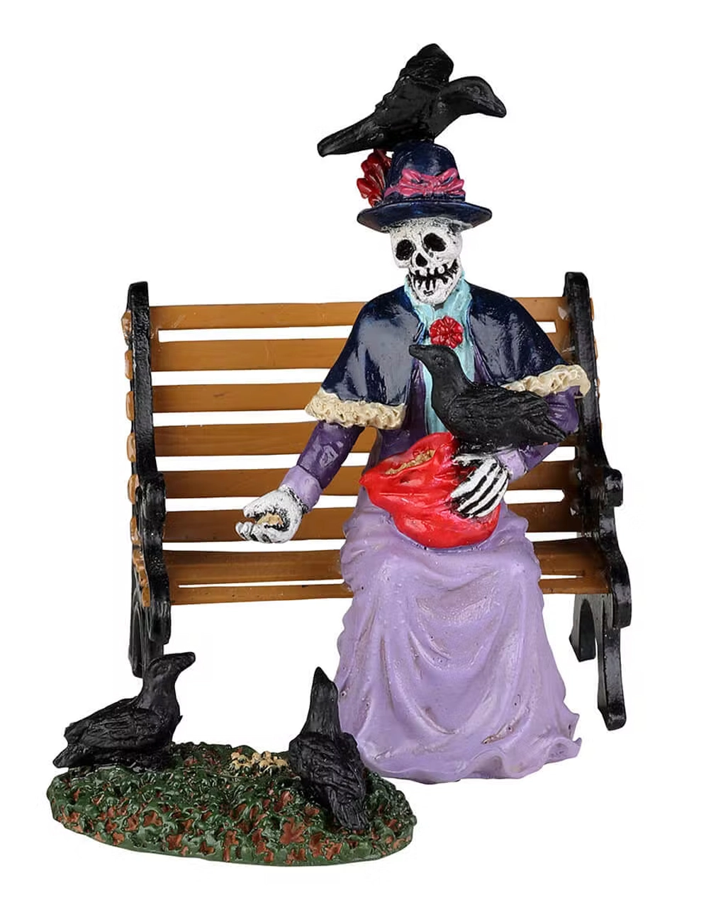 Die in der Spooky Town lebenden schwarzen Raben, wissen genau, wo sie ihr Futter bekommen. Die alte Skelett-Lady nimmt auf ihrer liebsten Parkbank Platz & füttert vergnügt ihre Vögelchen. Vier, schwarze Raben sitzen auf ihrem Hut, auf dem Boden, unter ihrem langen Rock und sogar auf ihrem Schoß. Das Skelett der Feeding the Birds Figur, wird eine Sehenswürdigkeit in deinem Spooky Town Park sein.